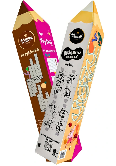 Każde opakowanie to nie tylko słodki prezent, ale także zabawa – na ściankach znajdują się plan lekcji, krzyżówka, labirynt i gra z QR kodem.