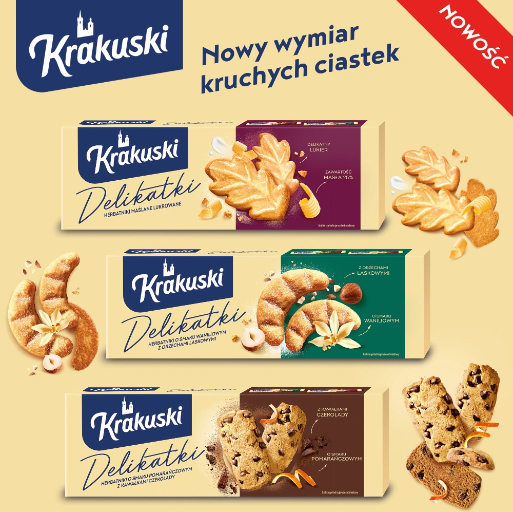 Marka Krakuski, znana z doskonałej jakości wypieków i będąca wiceliderem kategorii ciastek, wprowadza na rynek nową linię produktów – Krakuski Delikatki. To wyjątkowe połączenie tradycji, jakości i nowoczesnego podejścia do słodkich przekąsek, które idealnie wpisują się w codzienne chwile relaksu – przy kawie, herbacie czy jako mały deser w ciągu dnia.